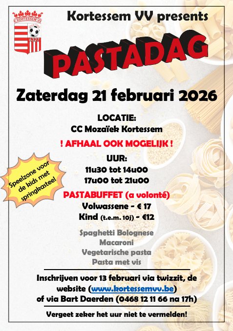 Schrijf je nu in voor onze pastadag op de website, twizzit of via Bart Daerden (0468 12 11 66 na 17h)